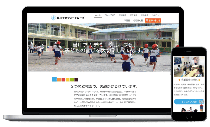 ホームページの制作実績が増えました。今回お任せいただいたのは「黒川アカデミーグループ」さまのホームページリニューアルです。3つの幼稚園に加え、学習塾とそろばん塾も運営しており、充実した教育内容が伝わる構成やコンテンツを提案いたしました。